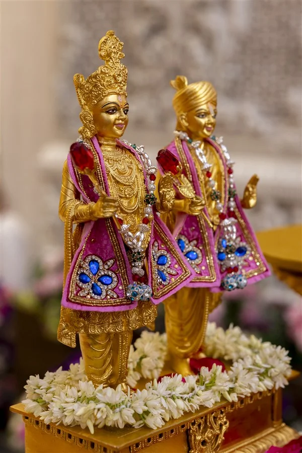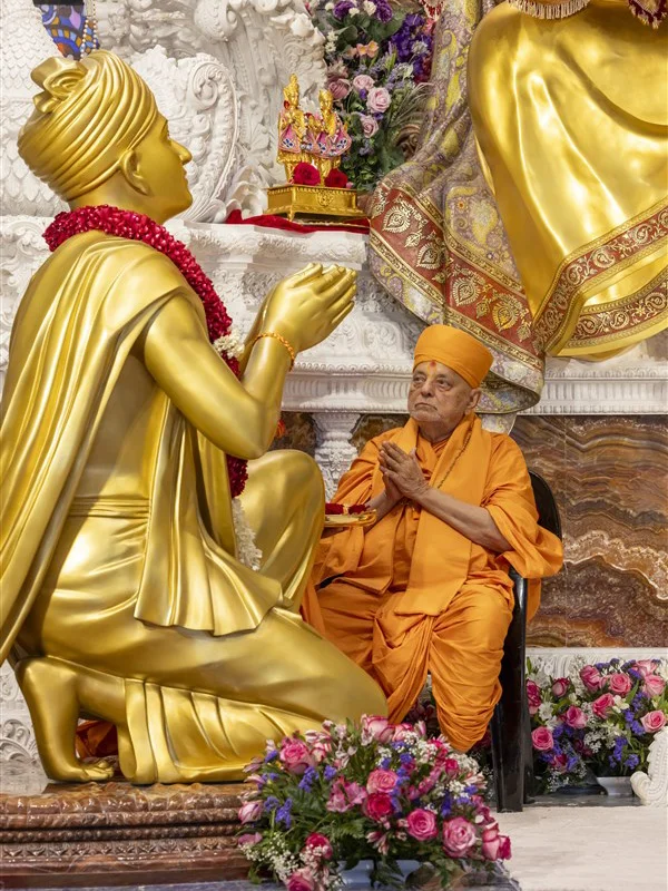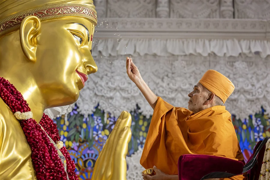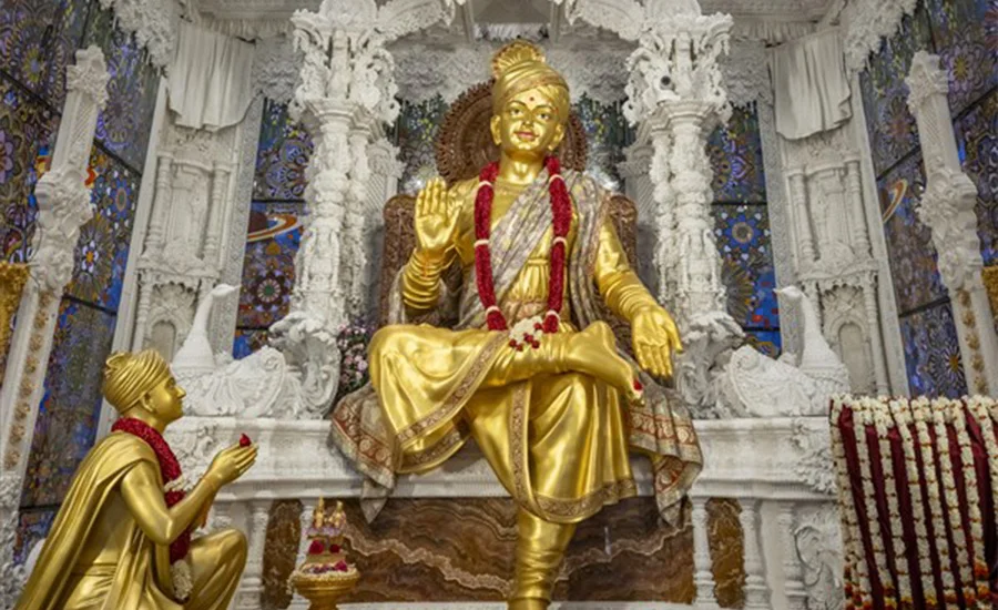 Akshardham Tapınağı'ndaki heykeller "taştan Hindu medeniyetinin tarihi" olarak tanımlanabilir. Ana salonda bulunan 19. yüzyıl Hindu ruhani lideri Bhagwan Swaminarayan'ın dev heykelinden, parkın girişindeki 49 fit uzunluğundaki bronz Nilkanth Varni heykeline kadar her heykel dini anlatılar ve kültürel semboller taşır. Örneğin, Nilkanth Varni heykeli, tabanı yukarı bakacak şekilde yoga pozisyonunda tek ayak üzerinde durur ve azizin 1792'den 1799'a kadar yedi yıl süren 8.000 millik çileci yolculuğunu yeniden yaratır. Dinamik detayları ve dini çağrışımları bakır dokusuyla sonsuza dek donmuştur.